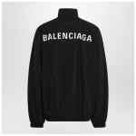Balenciaga sweatshirt in black technical fabric, characterized by a front closure with double zip, long sleeves, raised collar, elasticized cuffs and hem, two side welt pockets, and contrasting embroidered logo lettering on the chest and back.