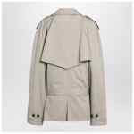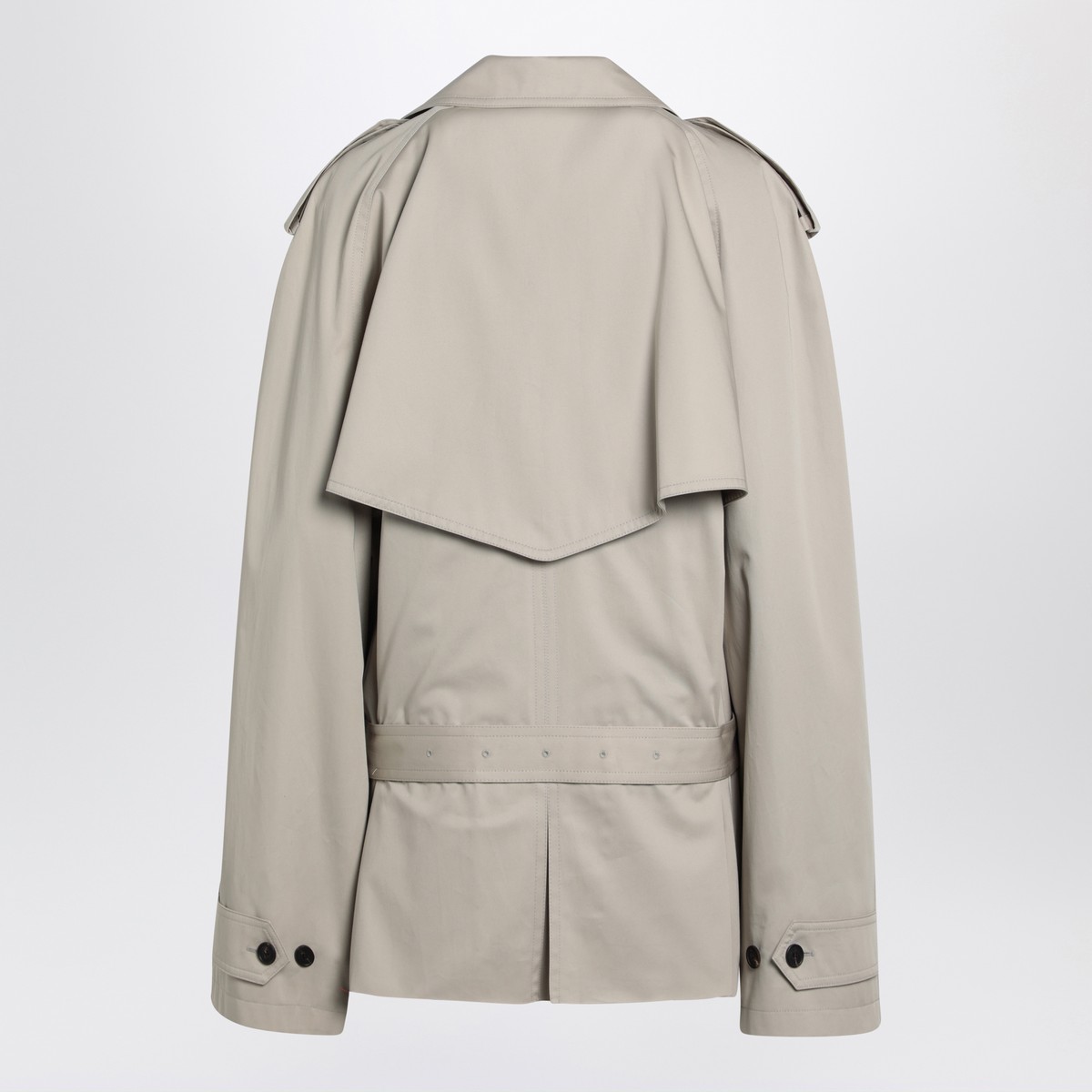 Beige cotton twill trench coat by Balenciaga, characterized by a wide lapel, epaulettes on the shoulders, windbreaker flap on the front and back, two side pockets with flap and button, wide long sleeves with buttoned straps at the wrists, adjustable waist belt, slit at the back and raw hem.
