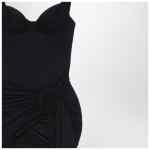 Balenciaga mini dress in matte black jersey featuring a swimsuit-inspired design, open back, draped panels with tone-on-tone buckle, long front panel on the right side, and adjustable straps.