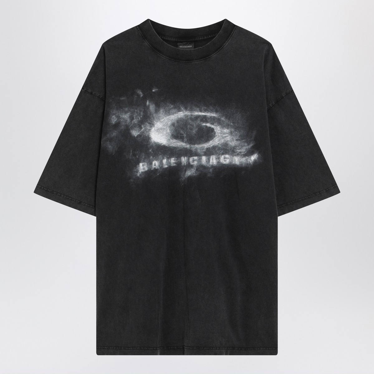 Balenciaga black vintage-effect oversize cotton T-shirt featuring a ribbed crew neck, short sleeves, dropped shoulders, worn-effect design and Washed Crayon Loop print on the front.