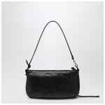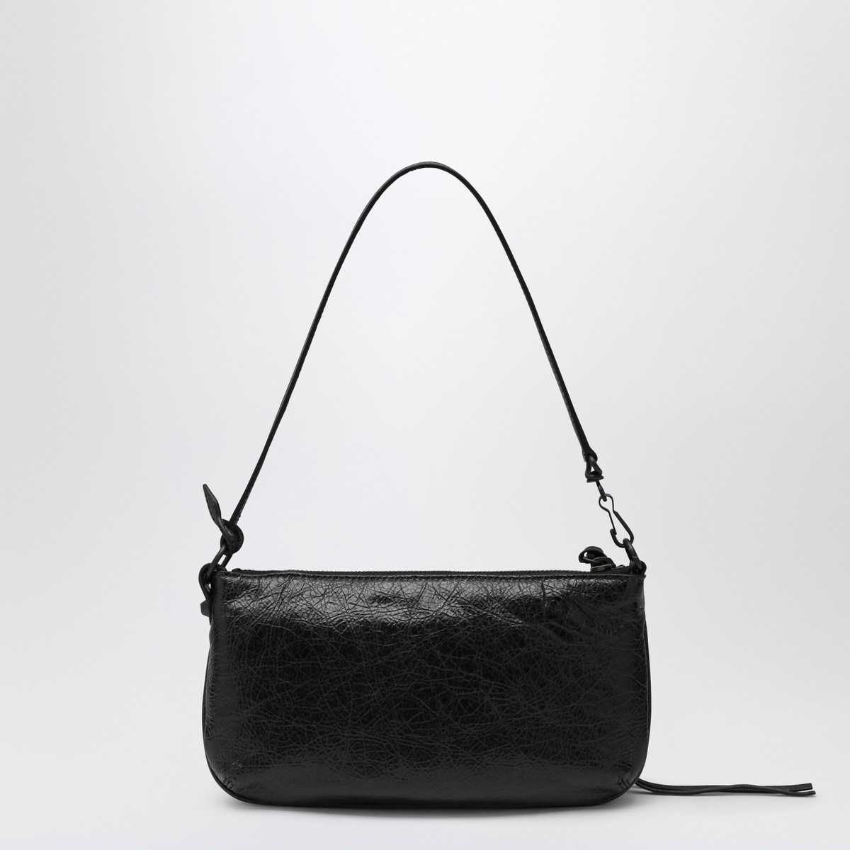 Black Arena lambskin pouch by Balenciaga, featuring adjustable and removable shoulder strap, brass finishes, zip closure with knotted leather pull, one front zip pocket with knotted leather pull, six internal card slots, and cotton canvas lining.