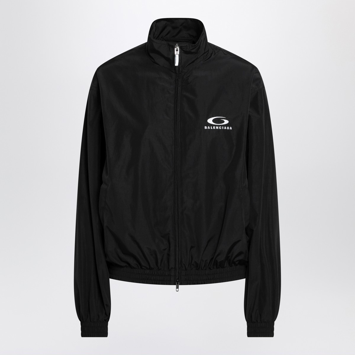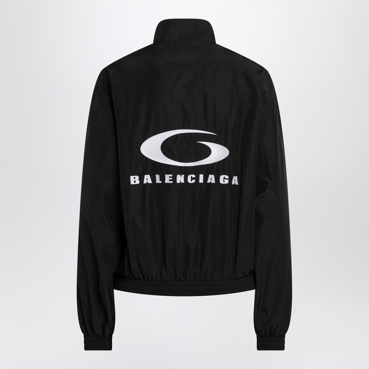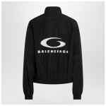 Jacket by Balenciaga in black cotton blend, featuring front zip closure, long sleeves, dropped shoulders, high collar, elasticated cuffs and hem, two side pockets, contrasting embroidered Loop Sports Icon motif on the front and back and an oversized fit.