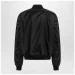 Black nylon bomber from Balenciaga, featuring a front closure with double zip, two flap pockets with snap buttons, long sleeves with one having a zip pocket and logo patch, ribbed knit edges, Uniform Merch logo patch on the chest, and an oversized fit.
