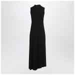 Long dress by Balenciaga in black stretch jersey, characterized by a round neckline, asymmetrical hem, draped look, and zip closure at the back.