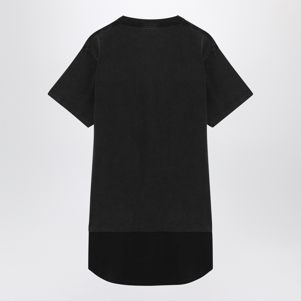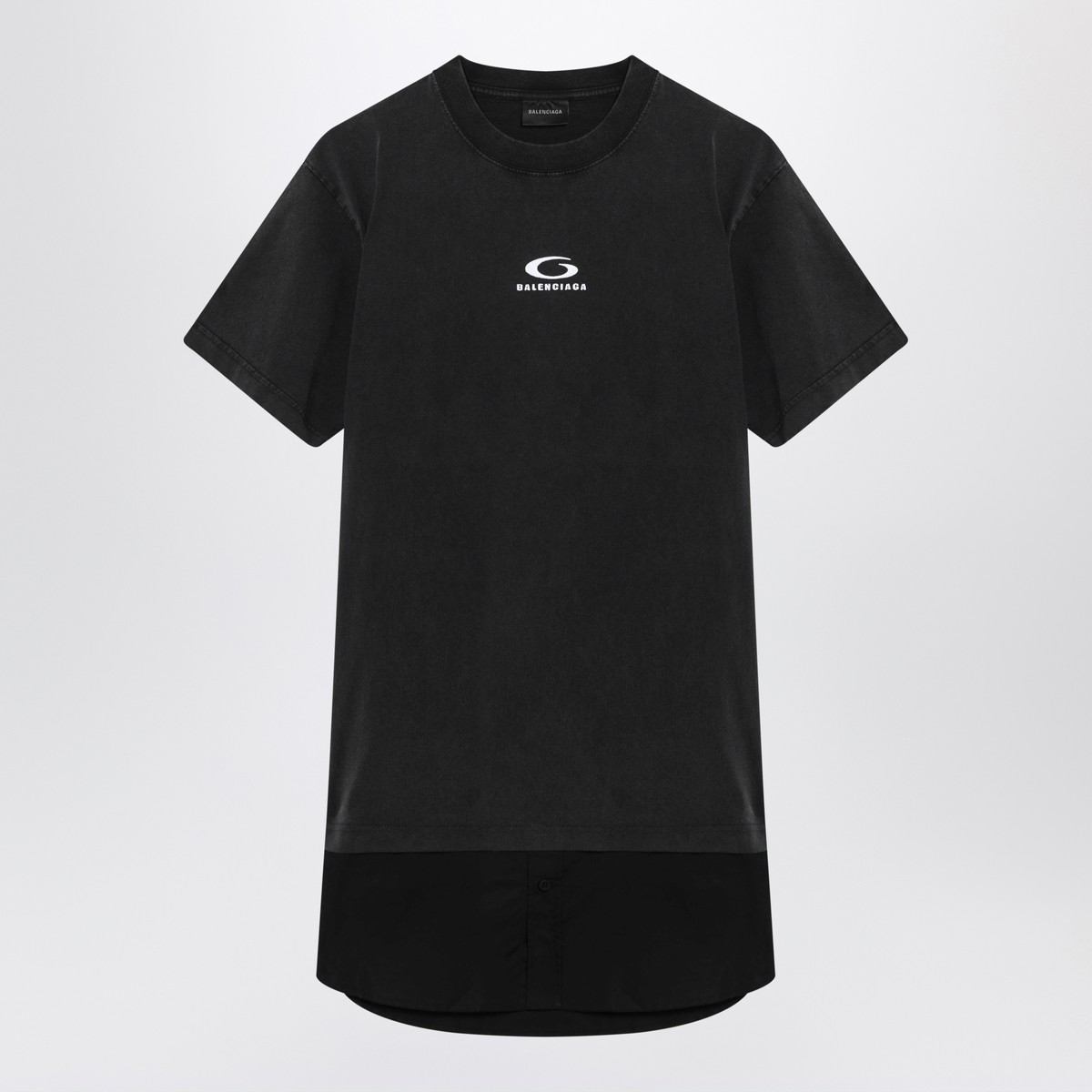 Black washed cotton mini dress by Balenciaga, featuring a ribbed crew neck, short sleeves, curved hem and contrasting Loop Sports Icon motif on the front.