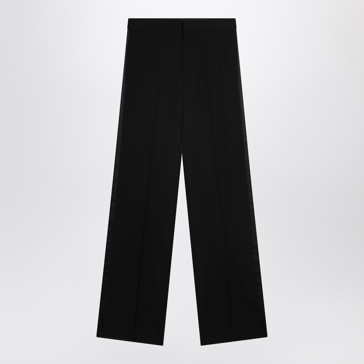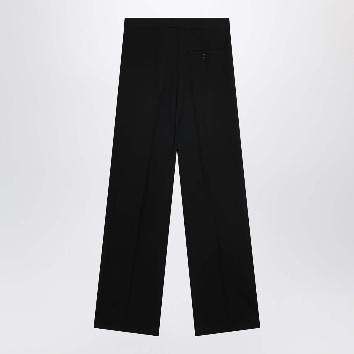 Balenciaga black wool trousers, featuring front closure, high waist, two side pockets, one rear welt pocket with button and pressed creases on the front and back.
