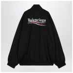 Black cotton blend sweatshirt by Balenciaga, featuring long sleeves, front zip closure, high collar, elasticated edges, two side welt pockets, Political Campaign logo embroidery on the chest and contrasting Political Campaign logo on the back.