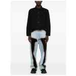 Black, cotton, denim, classic collar, long sleeves, buttoned hems, two flap pockets on the chest, two side welt pockets and front button closure. Denim cotton jacket