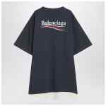 Balenciaga T-shirt in navy blue cotton jersey with a vintage effect and white, characterized by a ribbed crew neck, wide short sleeves, layered design, Political Campaign print on the front and back in contrast, and an oversized fit.