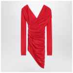 Red stretch jersey mini dress by Balenciaga, featuring a V-neck, long sleeves, intertwined draped design, asymmetric model with an open back and a fitted silhouette.