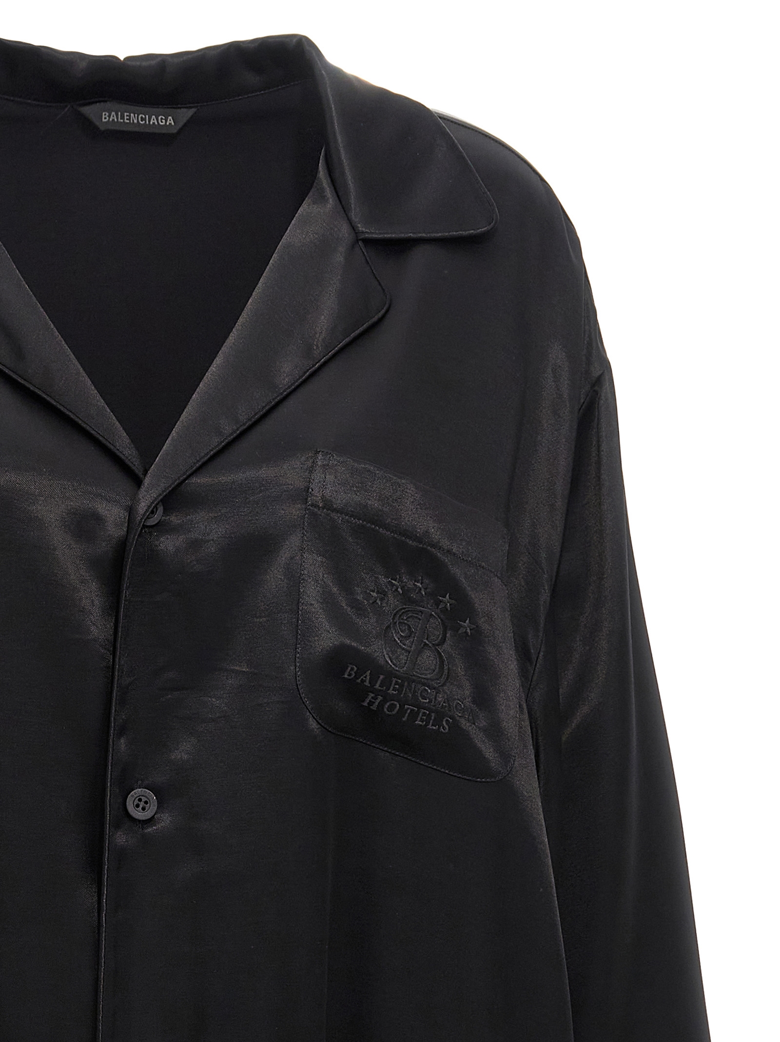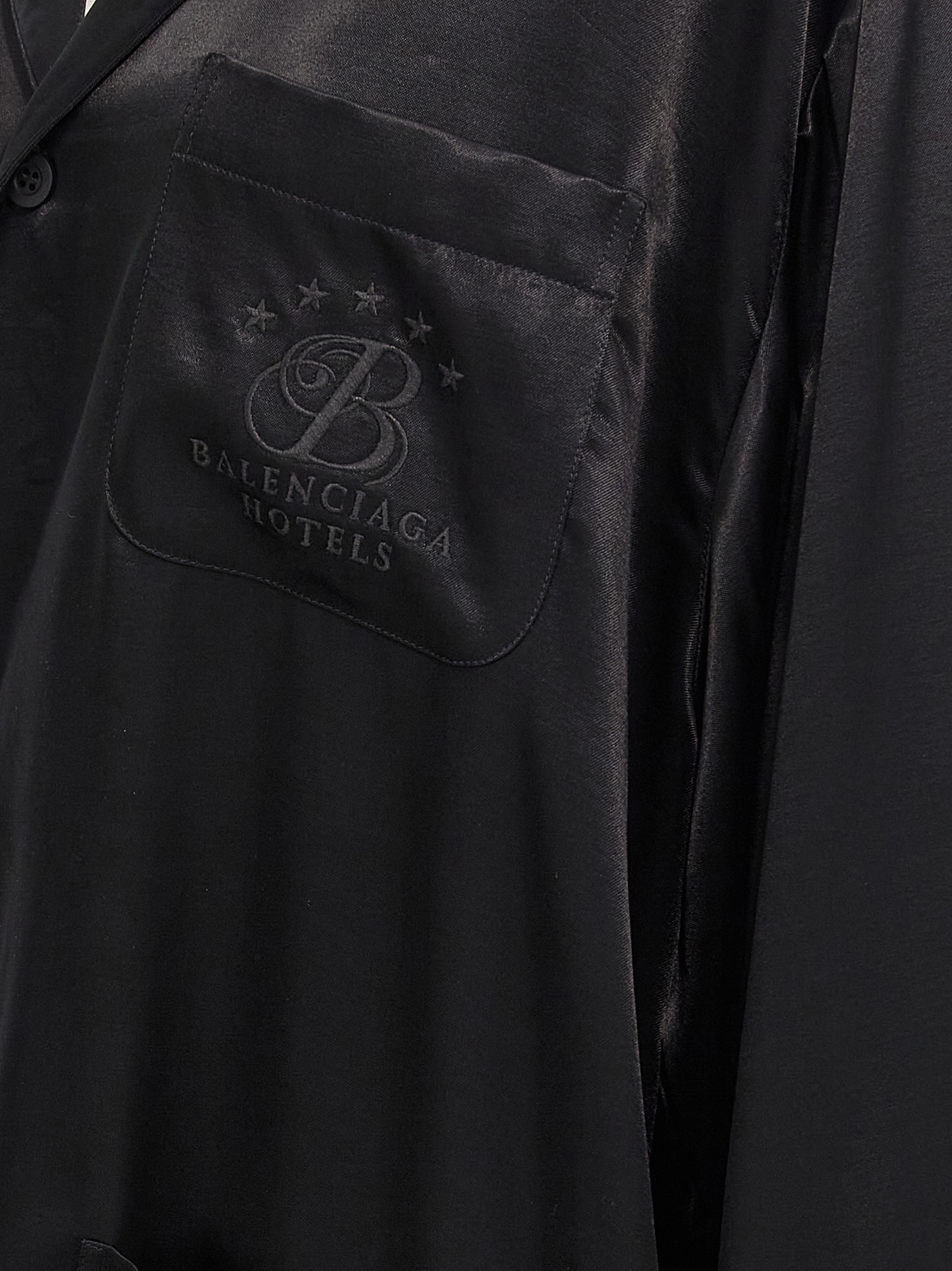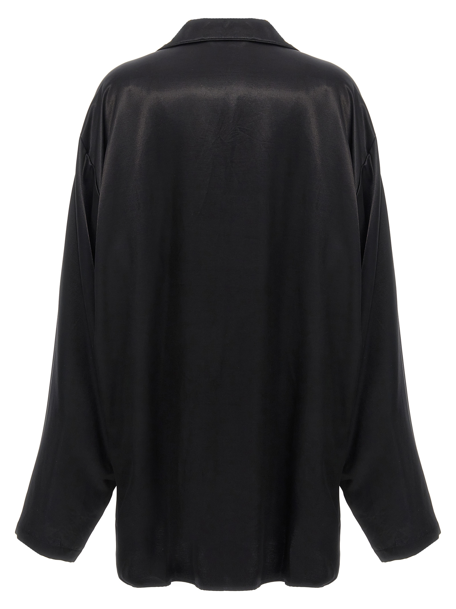 Viscose and cupro blend shirt, Pajama model, Pocket with tone-on-tone embroidered logo, Button closure, Long sleeves. Size and Fit – oversized fit
