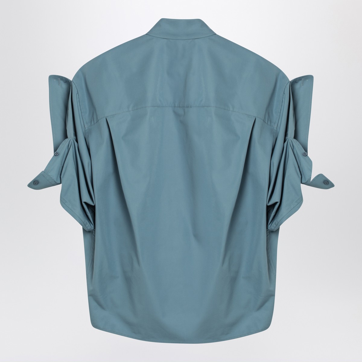 Balenciaga grey-blue cotton shirt, featuring a button-down collar, front button closure, short wing sleeves with turn-up, one chest patch pocket with embroidered logo lettering and a curved hem.