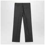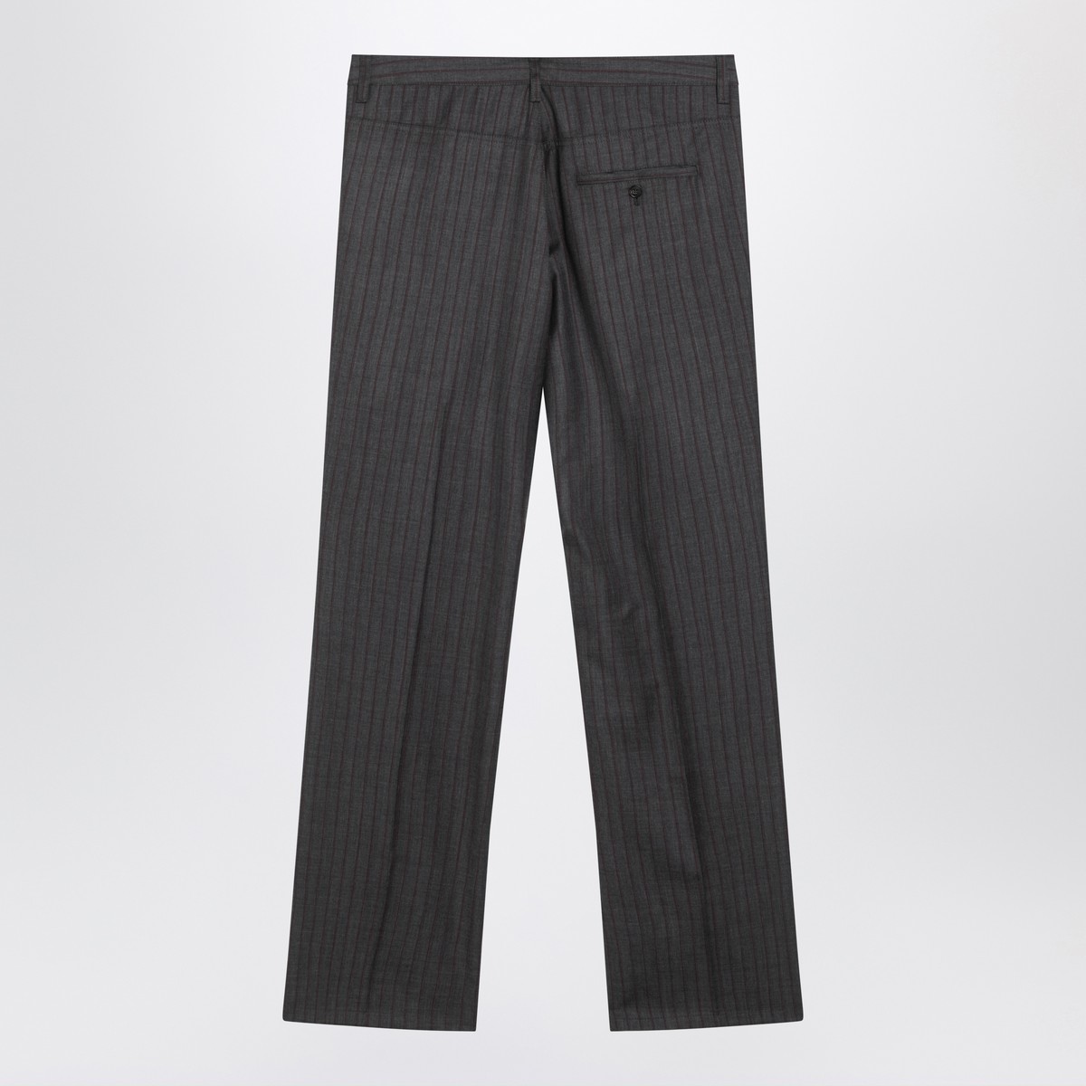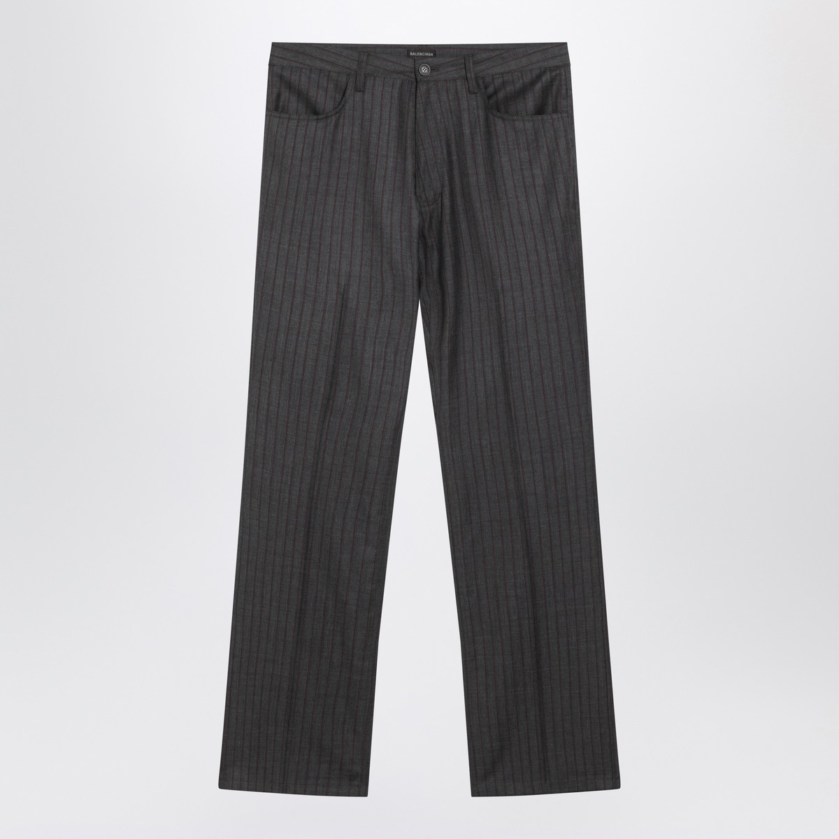 Balenciaga grey wool pants with red pinstripes, featuring front zip and button closure, belt loops, two front pockets, one back welt pocket with button, and pressed front crease.