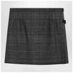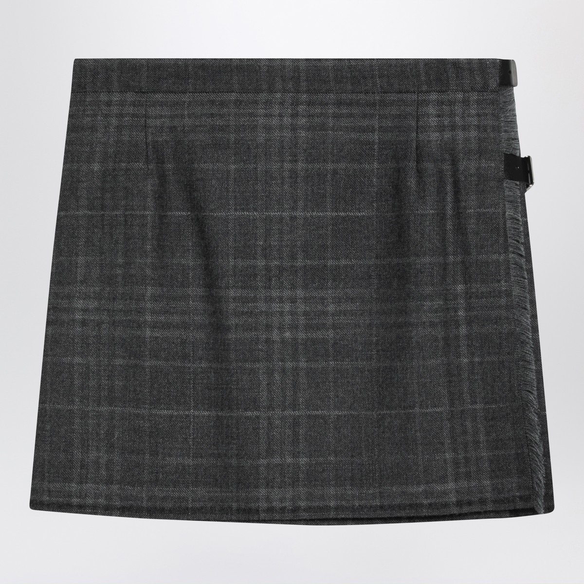 Grey wool tartan mini skirt by Balenciaga featuring pleats on the front, double leather belt closure on the left side, silver-tone metal buckle with engraved logo, and fringed back.