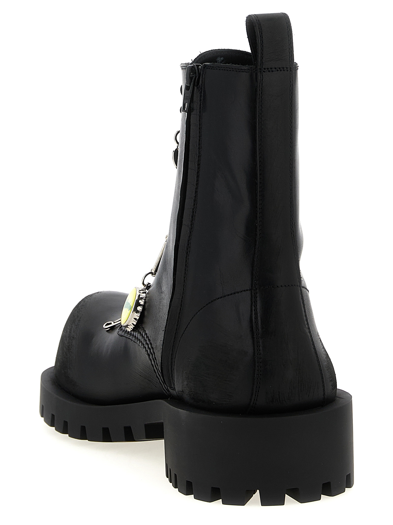 ‘Hummer’ used effect bull leather amphibians, slightly asymmetrical rounded toe, lace closure with charms inserted, side zip closure, thick notched rubber sole.