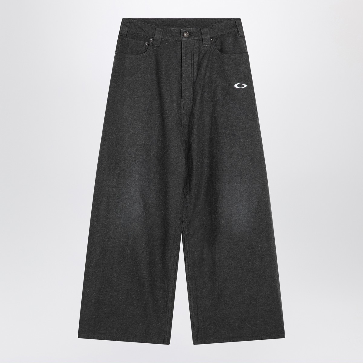 Balenciaga pants in anthracite grey cotton denim with a faded effect, characterized by a mid-rise, hidden zip fly, belt loops, five classic pockets, Loop Sports Icon motif on the front, logo patch on the back, and a wide fit.