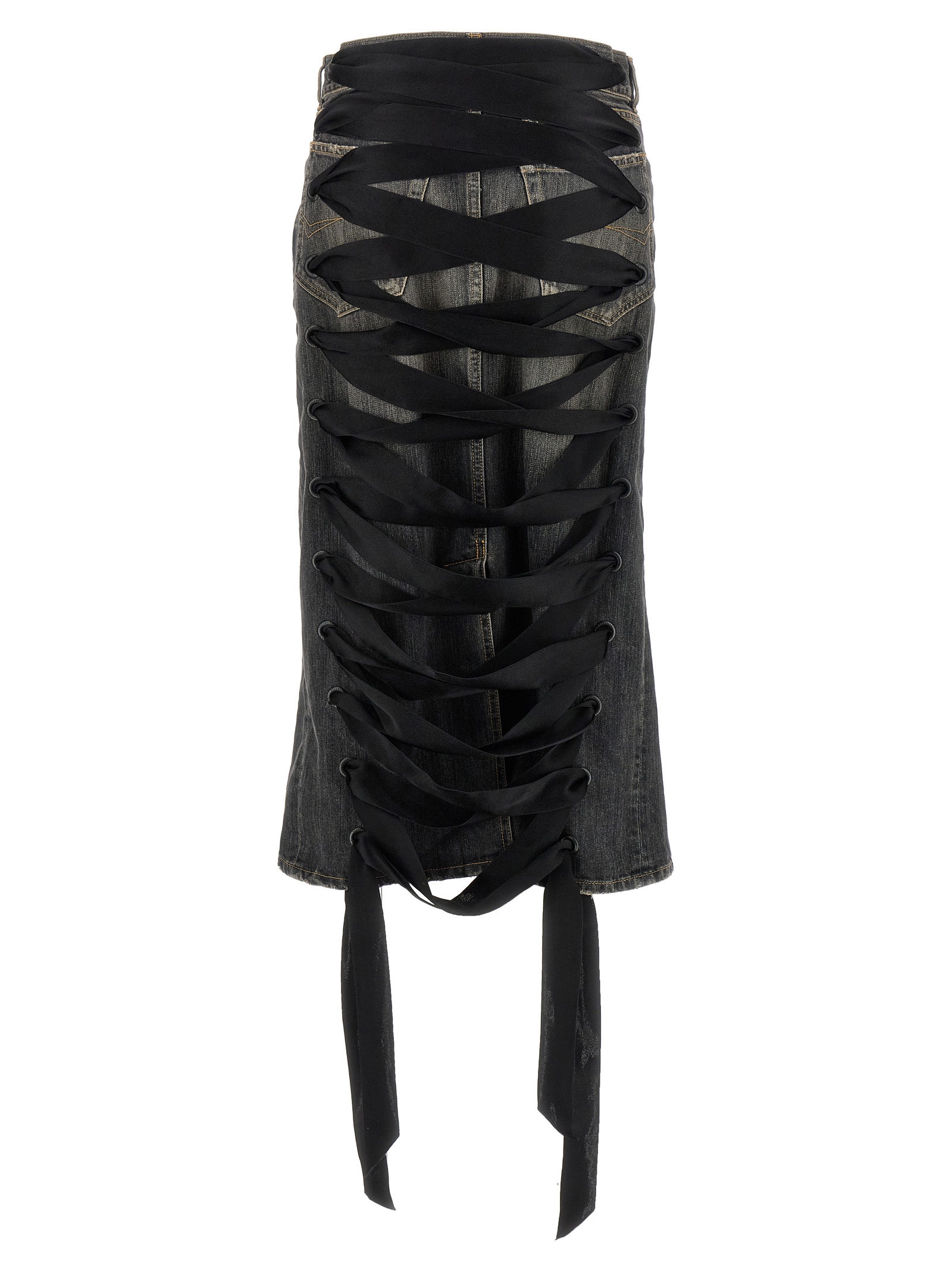 Lace Up’ midi skirt in stonewashed cotton denim with used effect, front button closure, five pockets, long ribbon lace detail and a back split.