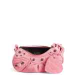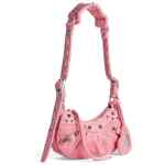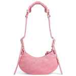 mini Le Cagole shoulder bag from BALENCIAGA featuring flamingo pink, felted finish, stud detailing, decorative buckle detailing, braid detailing, top zip fastening, main compartment, internal logo patch, mirror tag and adjustable shoulder strap. Le Cagole XS leather shoulder bag