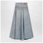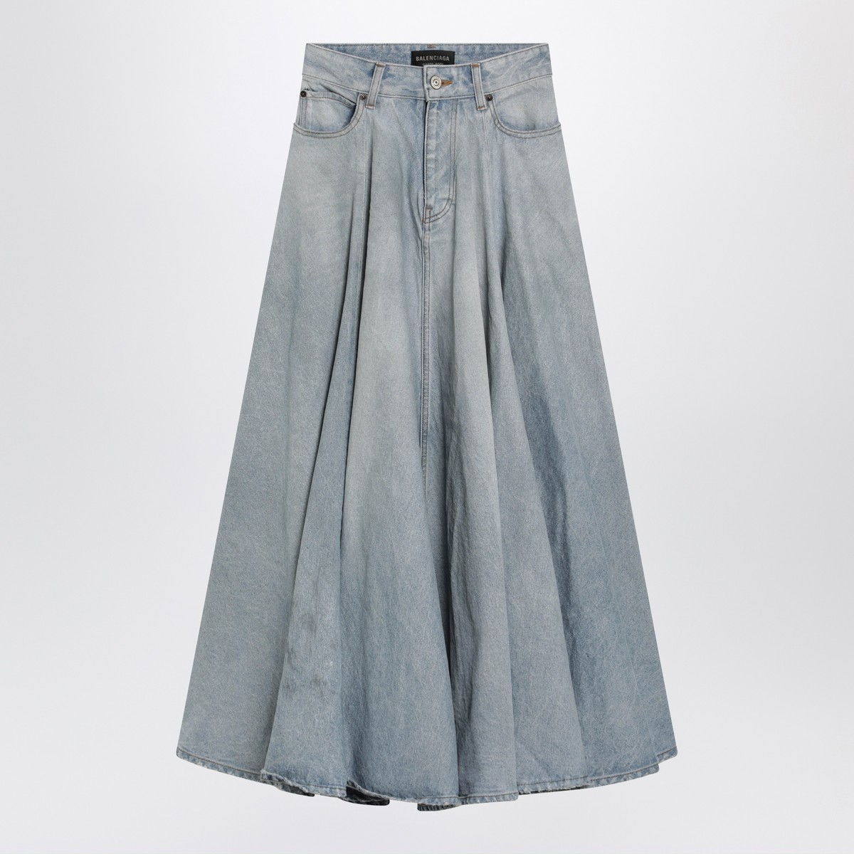 Balenciaga light blue vintage washed cotton denim maxi skirt with zip-and-button front closure, mid-rise waist with belt loops, five classic pockets, rear logo patch and godet hem.