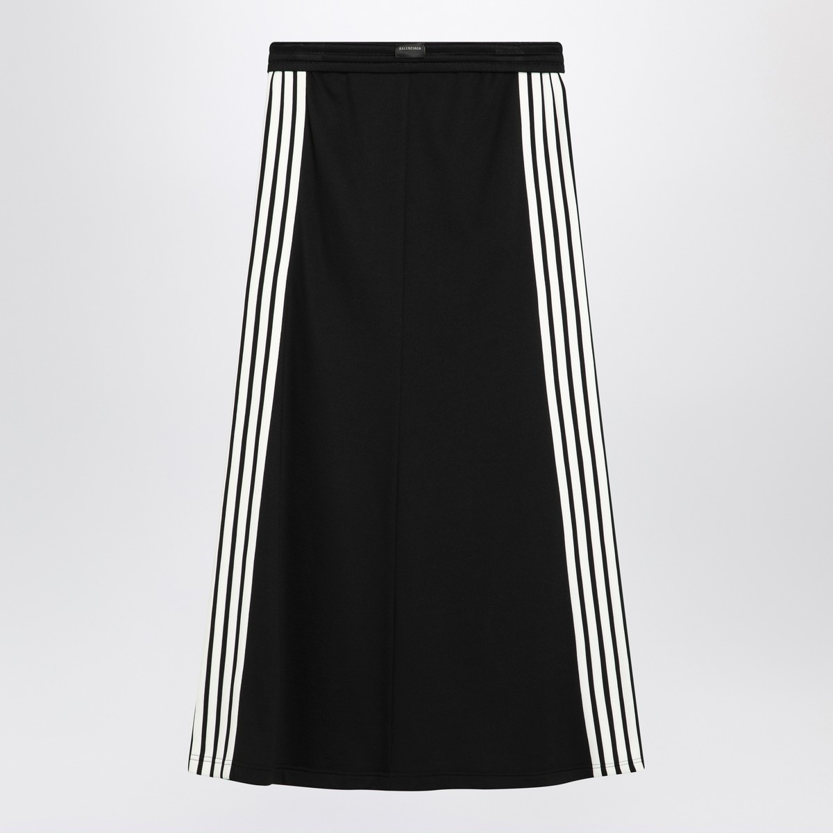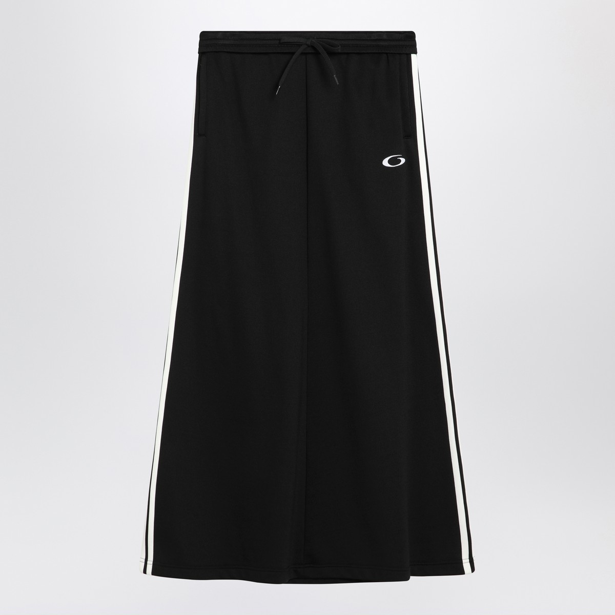 Black cotton Balenciaga long skirt, characterized by a drawstring at the waist, two side pockets, contrasting white bands on the sides, and a logo on the front.