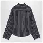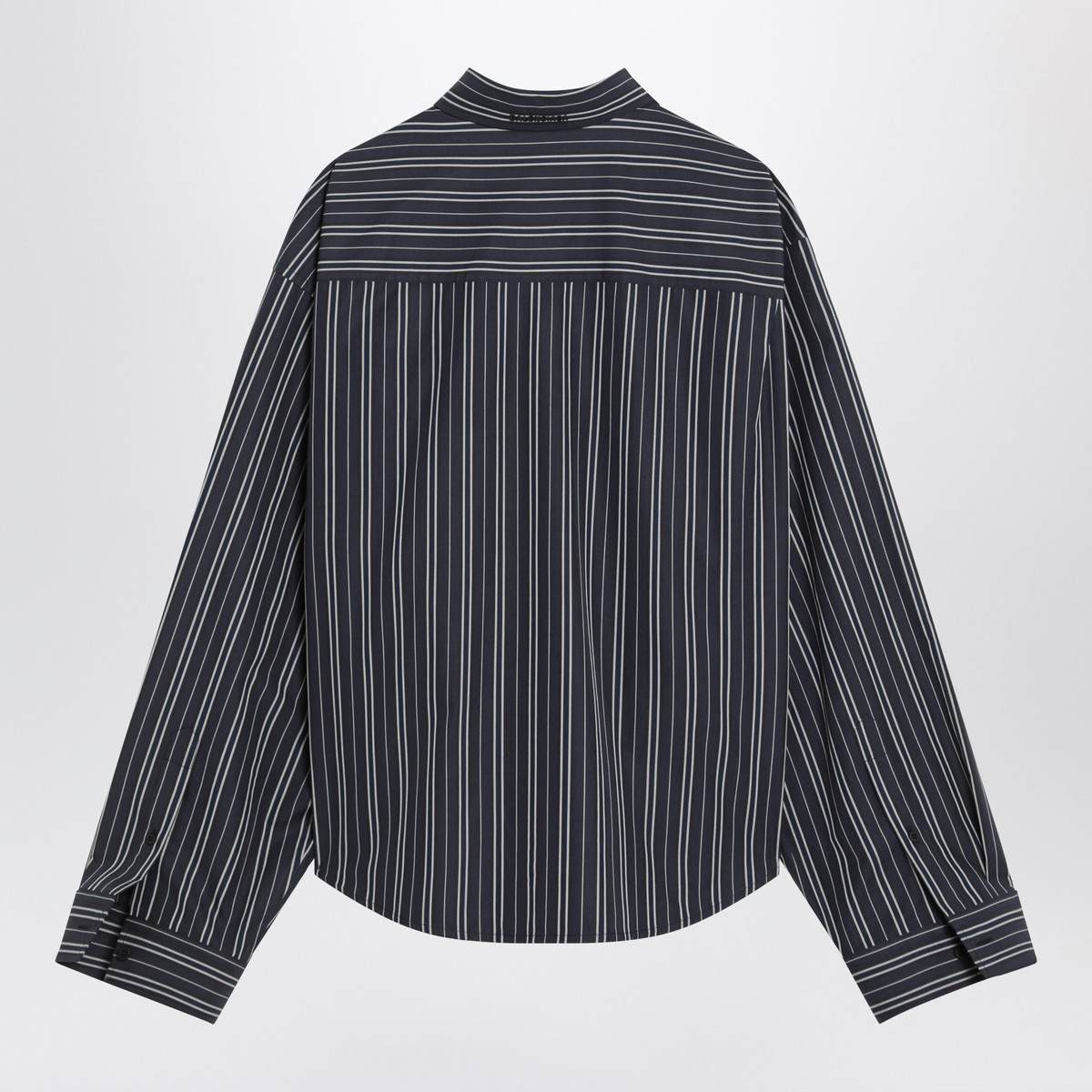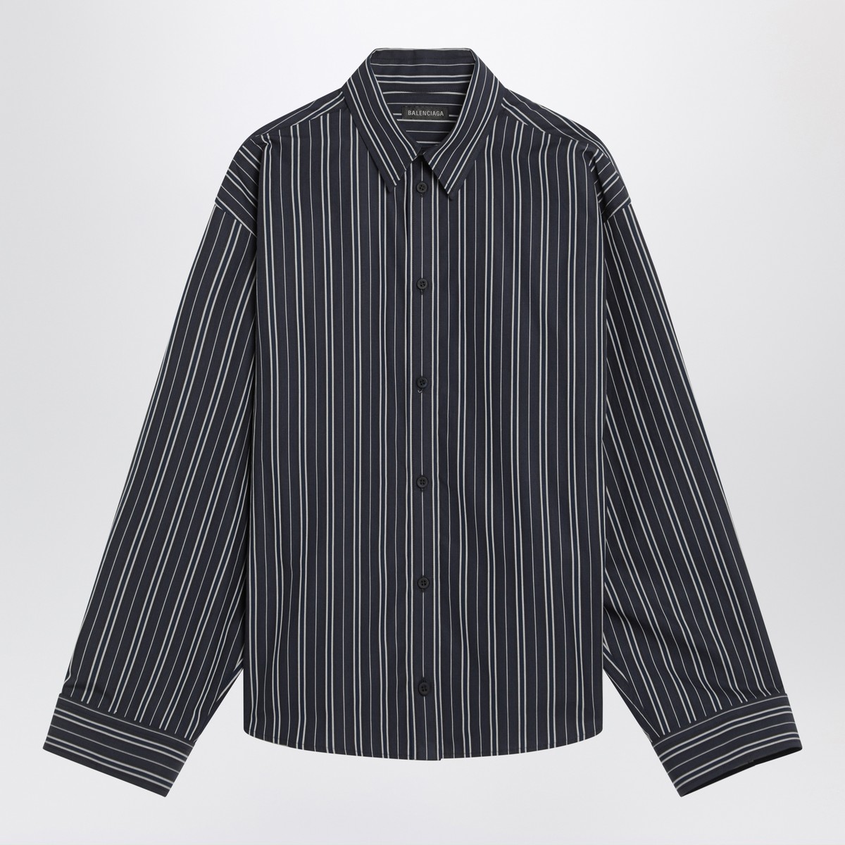 Balenciaga navy blue cotton shirt with stripes, featuring a front button closure, long sleeves with buttoned cuffs, a classic collar with embroidered logo lettering on the back, a curved hem, and an asymmetrical design with a slit at the front.