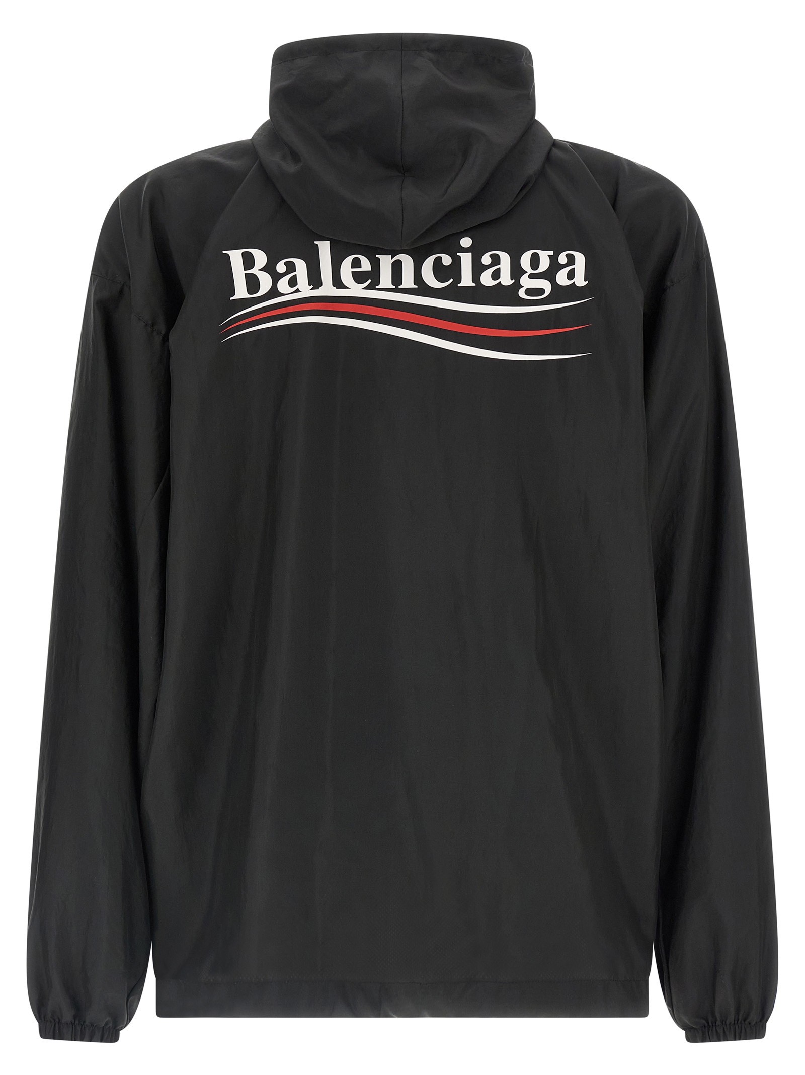 Windbreaker ‘Political Campaign’ water-repellent technical fabric, mesh lining, hood, embroidery on the front and back, zip closure and front snap buttons, long sleeves with elastic cuffs and dropped shoulders, drawstring on the hem.