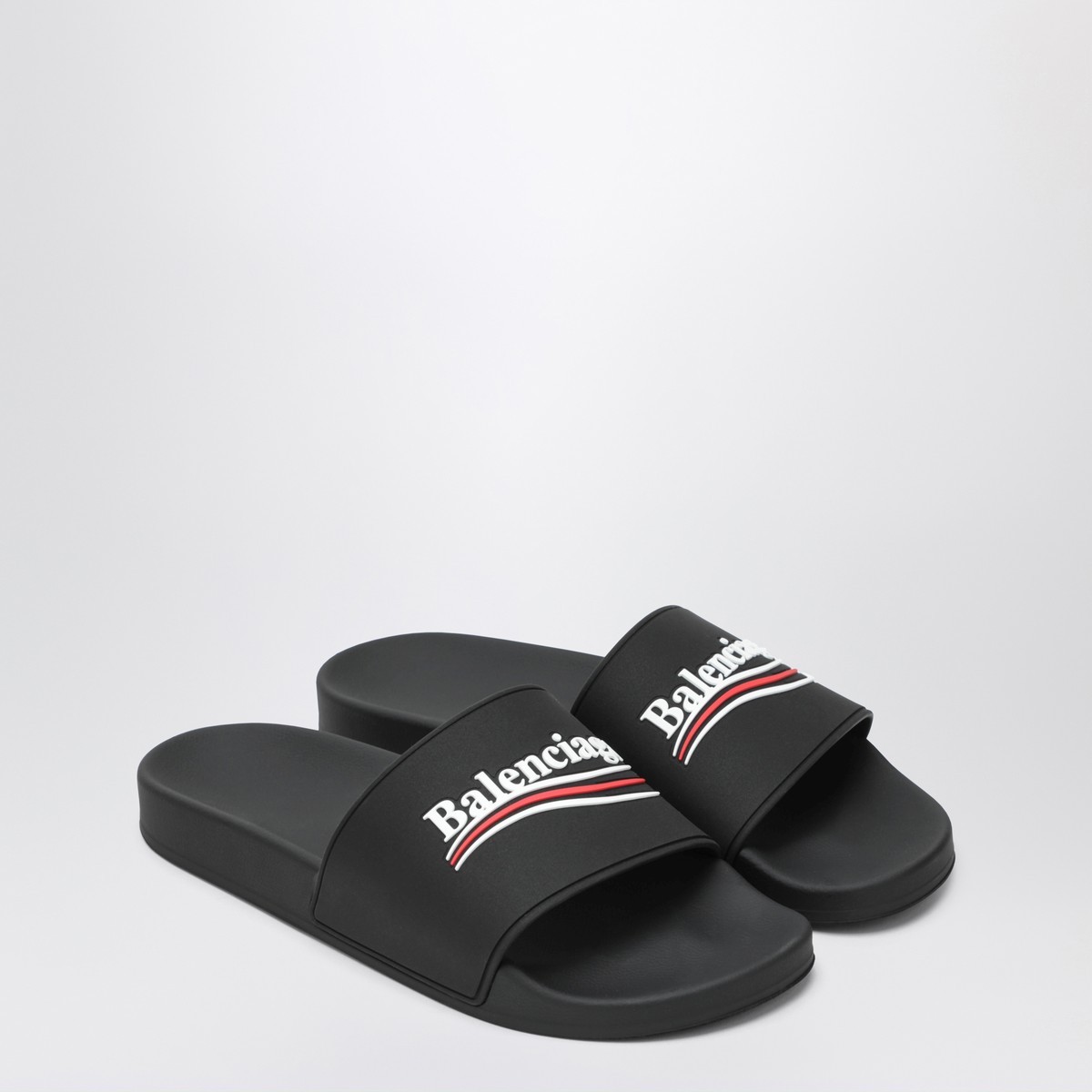 Balenciaga black rubber sandals featuring a political campaign motif on the strap, moulded rubber footbed and tone-on-tone sole and insole.
