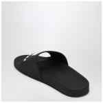 Black rubber Balenciaga sandals, featuring a unity sports icon motif on the strap and a molded rubber insole.