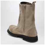 Balenciaga sand suede boots with side zip, rear pull tab, eyelet design without laces, logo patch tongue, round toe, and rubber sole.