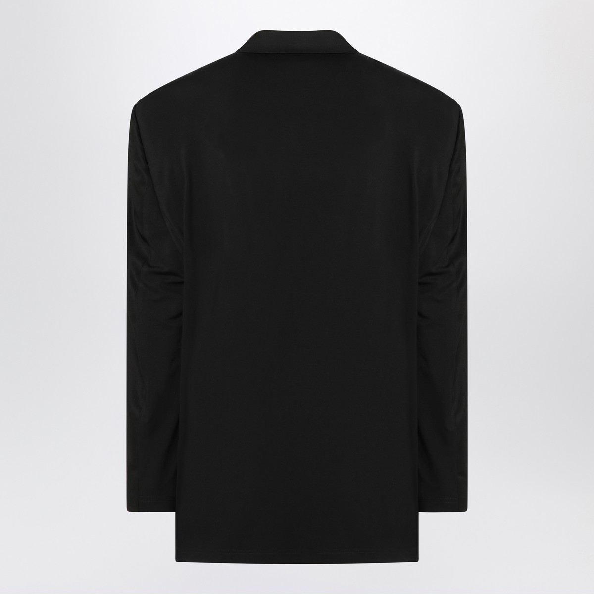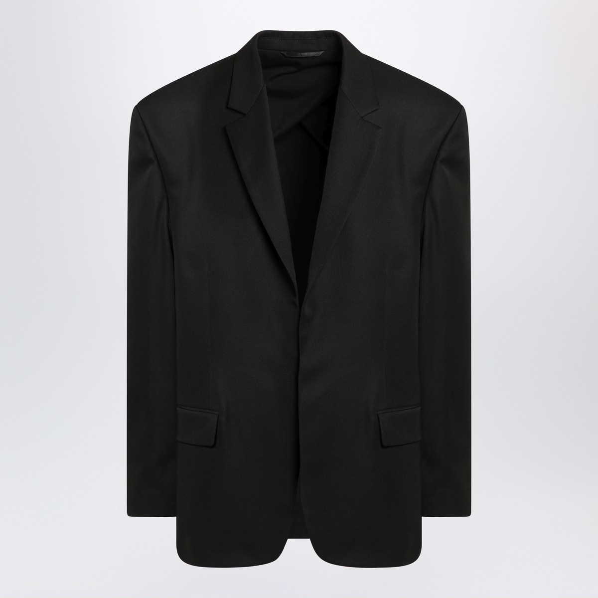 Single-breasted black wool jacket by Balenciaga, featuring classic lapels, two flap pockets at the front, front closure, and long sleeves.