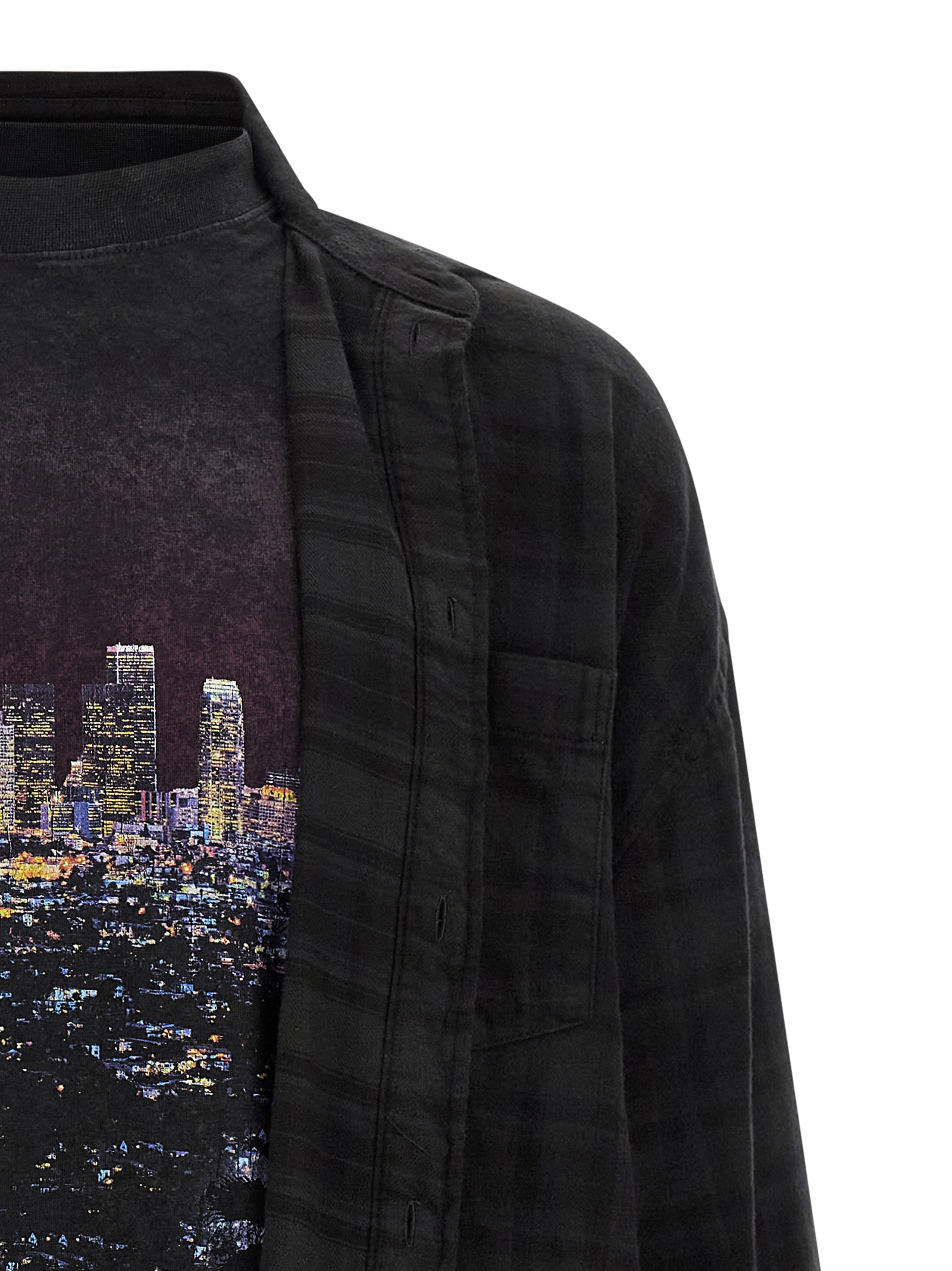 Check poplin cotton shirt and dry jersey t-shirt with front ‘City of Angels’ print, trompe l’œil layered effect construction, front button closure, breast pocket, long cuffed sleeves and dropped shoulder.