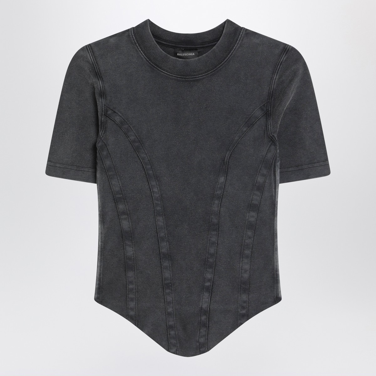 Balenciaga T-shirt in black stretch interlock jersey with washed effect, featuring short sleeves, ribbed crewneck, corset-style details on front and back with V-shaped hem.