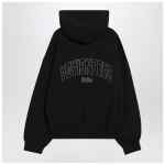 Black dry pile Balenciaga sweatshirt with a faded effect, featuring a hood, long sleeves with dropped shoulders, double-slider zip closure, two front pockets, gathered design on the cuffs and waist, Flipped Uni motif embroidered on the back, and ribbed edges.