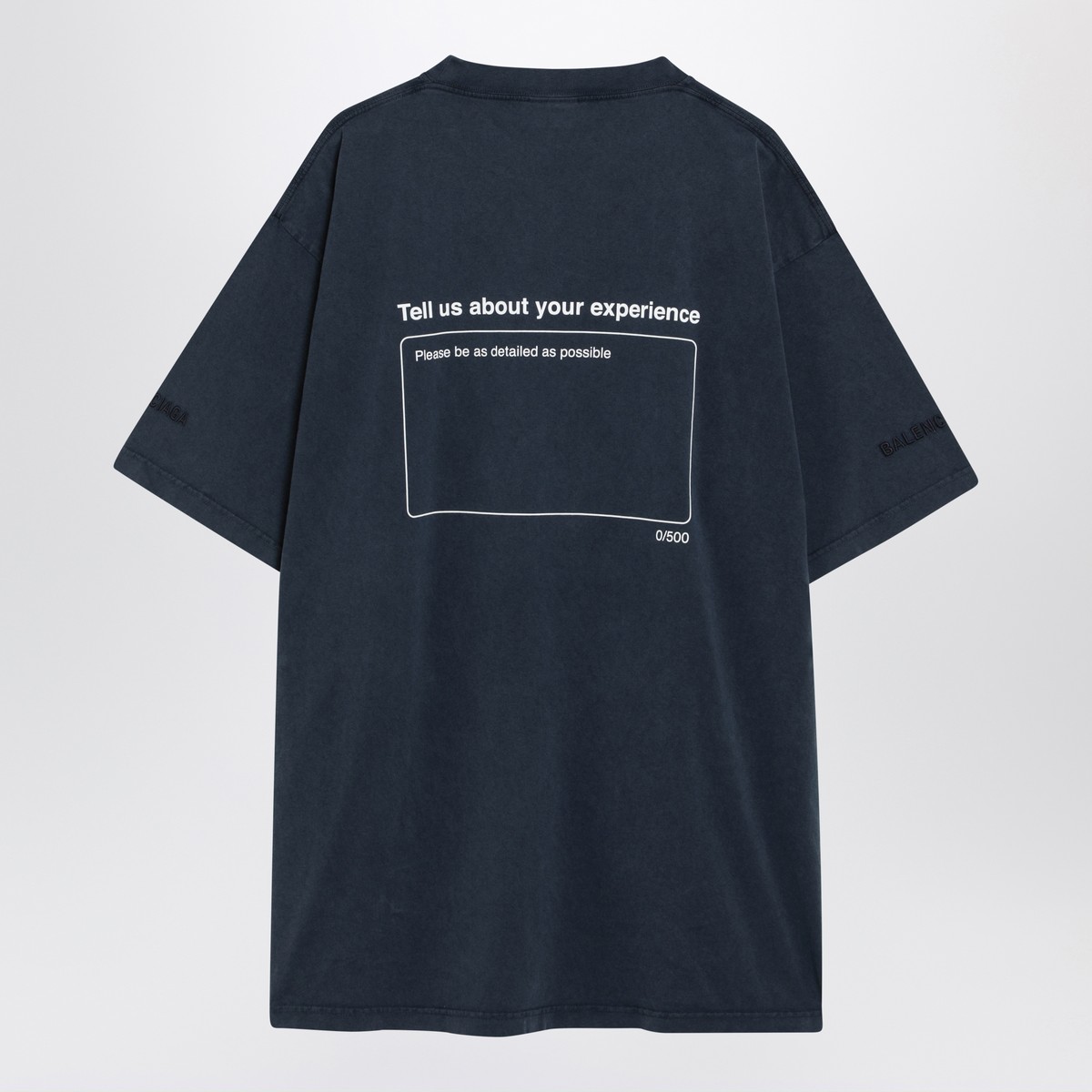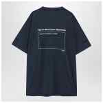 Balenciaga navy blue washed-effect cotton T-shirt featuring wide short sleeves, one with logo lettering embroidery, dropped shoulders, ribbed crew neck, logo prints on the chest and back and an oversized fit.