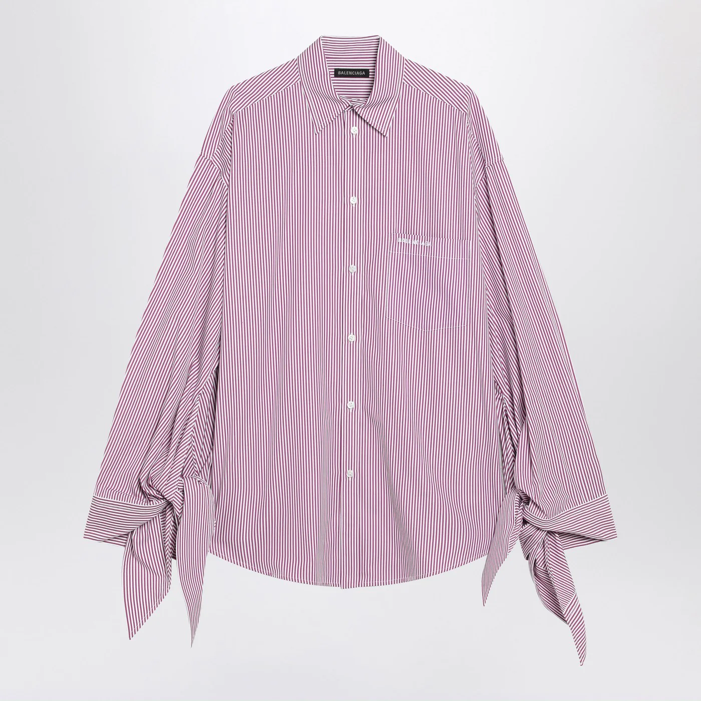 Balenciaga shirt in cotton with white and plum stripes featuring a front button closure a chest pocket with logo lettering embroidery long sleeves with buttoned cuffs and ties dropped shoulders and a loose fit.