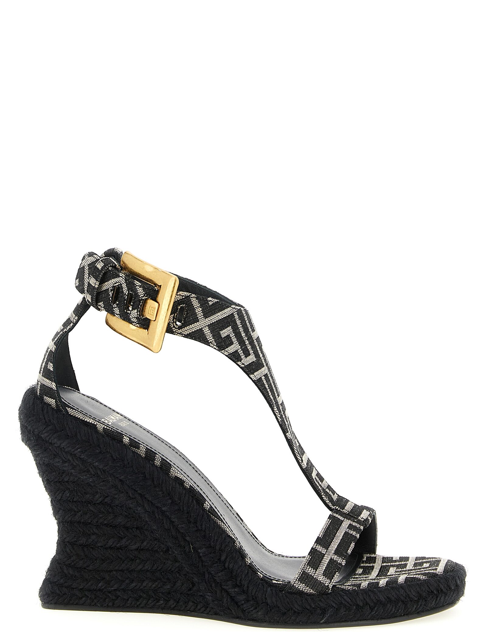 Monogram jacquard fabric espadrilles, Ankle-adjustable ankle strap with antiqued effect metal ‘anthem’ buckle, Rope wedge, Leather sole.