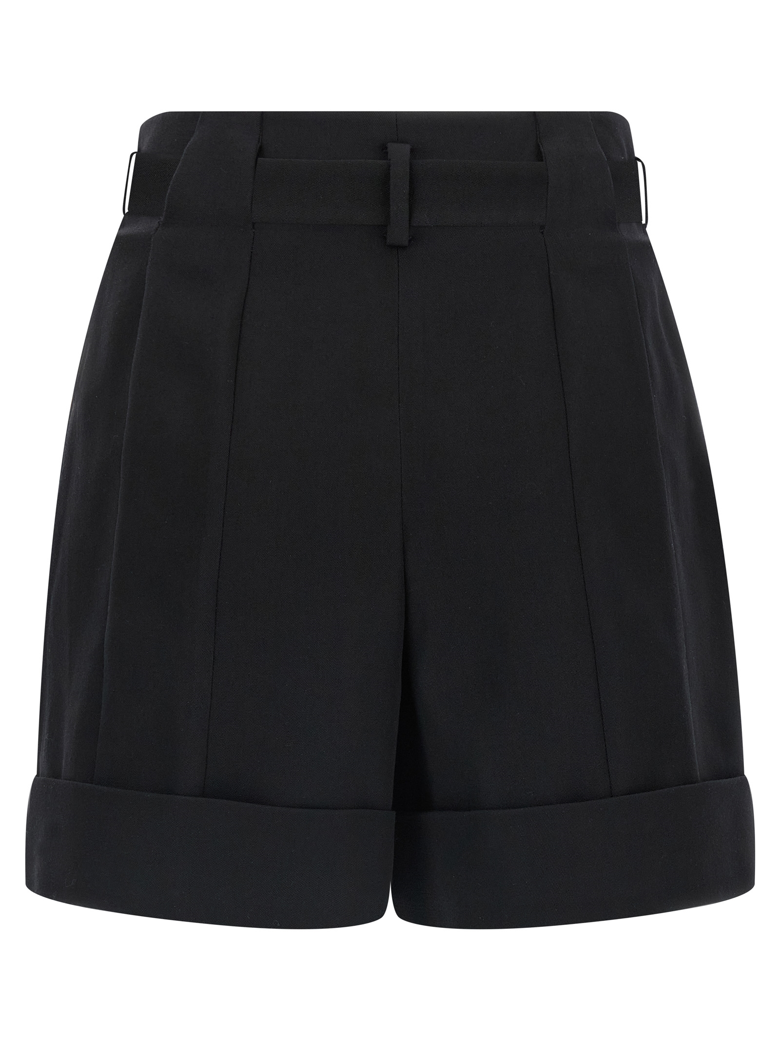 Grain de poudre wool shorts, high waist, front and back pin tucks, pockets, turn-up at the hem, belt with removable antiqued effect metal ‘Anthem’ buckle.