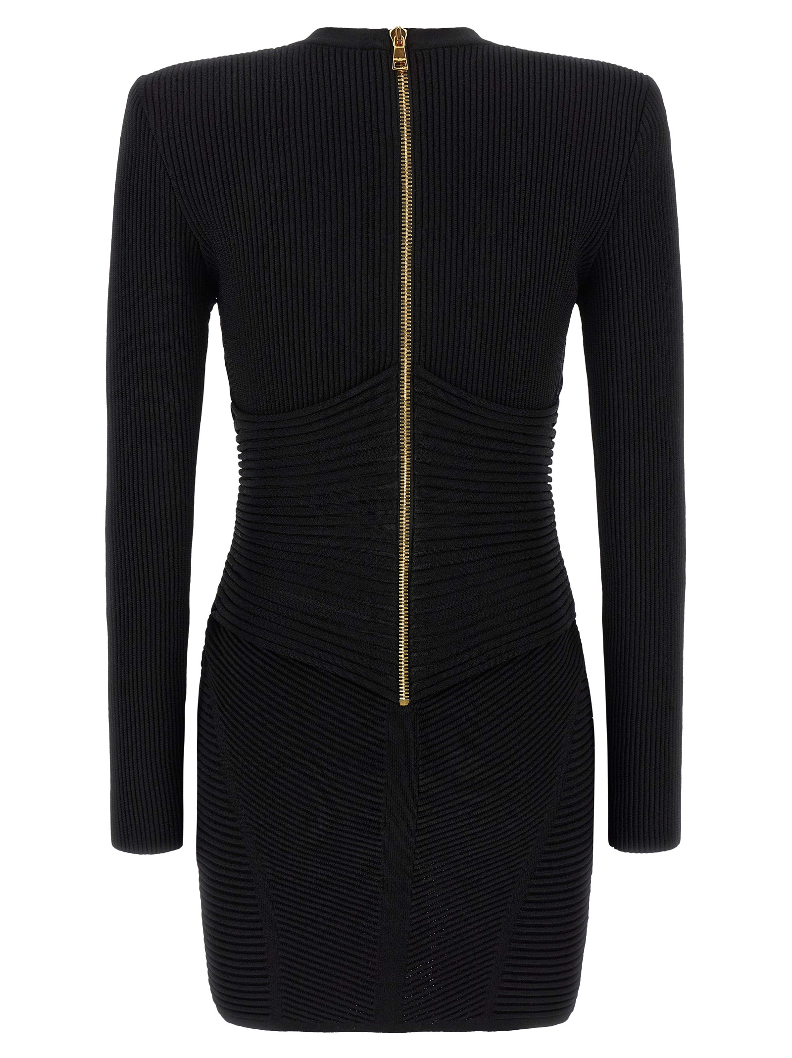 Bodycon stretch knit dress with deep V-neck and decorative metal ‘Gold and Gold Coin’ buttons on the front, padded shoulders, long sleeves, and back zipper closure.