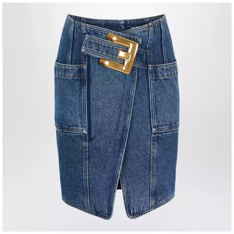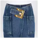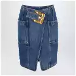 Midi skirt by Balmain in blue cotton denim Anthem belt at the waist with maxi gold finish metal buckle Side patch pockets Exposed back zip closure Logo engraved puller Straight fit.