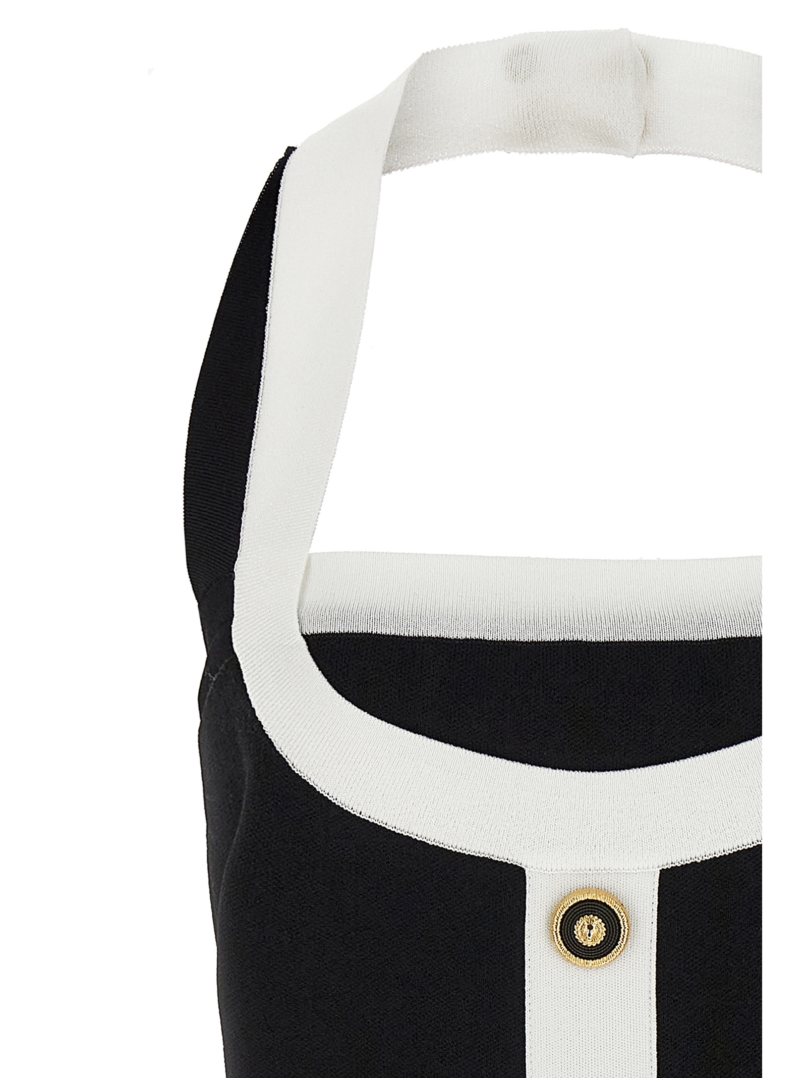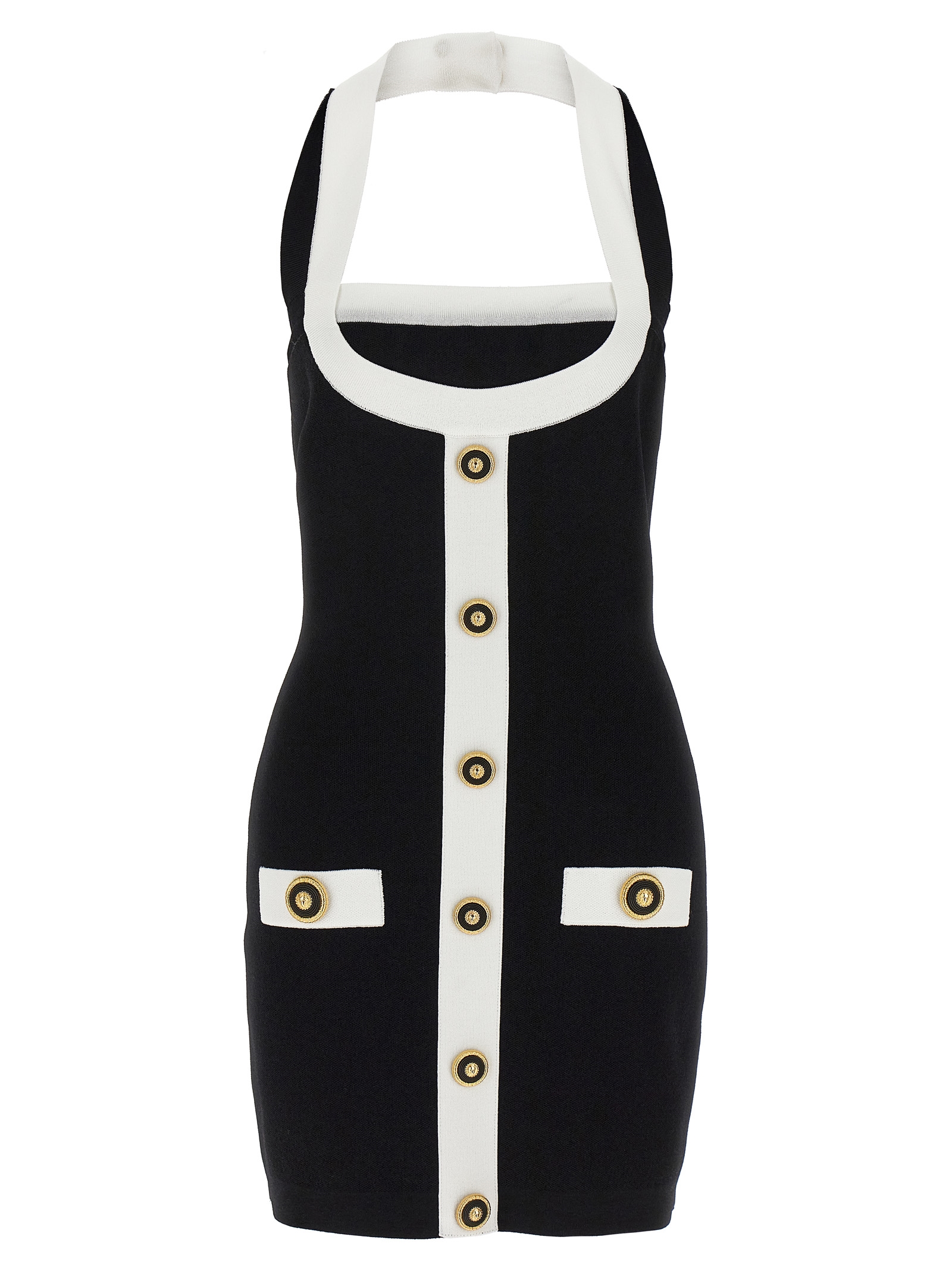 Dress in stretch viscose blend with trompe l’oeil details and ‘Filo Leone Catena’ buttons, bare back, back zip closure, sleeveless, neck strap with snap button closure.