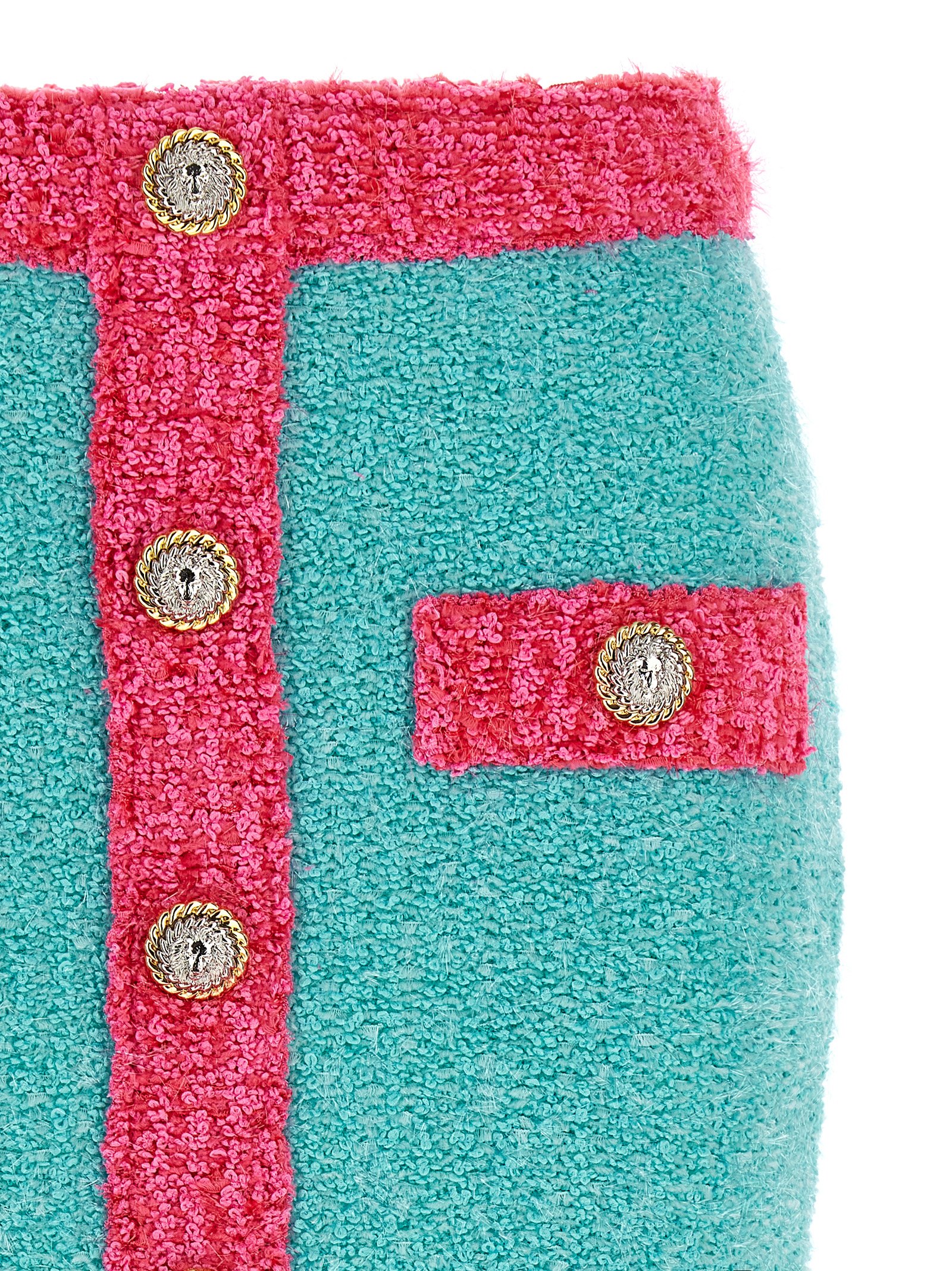 Two-tone cotton blend knit skirt, ‘Leone’ button appliqué, back zip closure.
