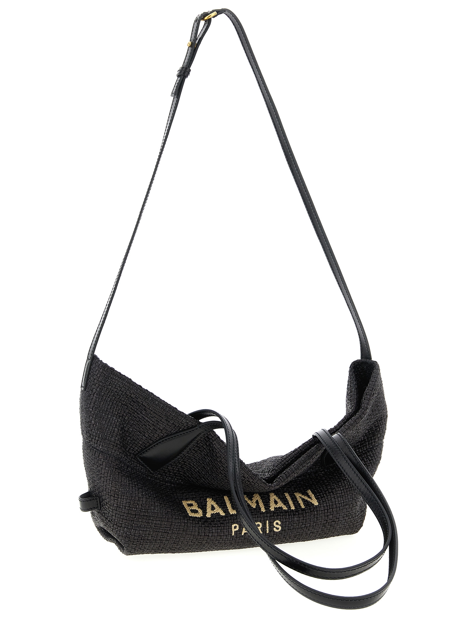 Shooping ‘Track-small rafia’, double fixed leather handle and adjustable leather shoulder strap, front logo embroidery, magnetic closure