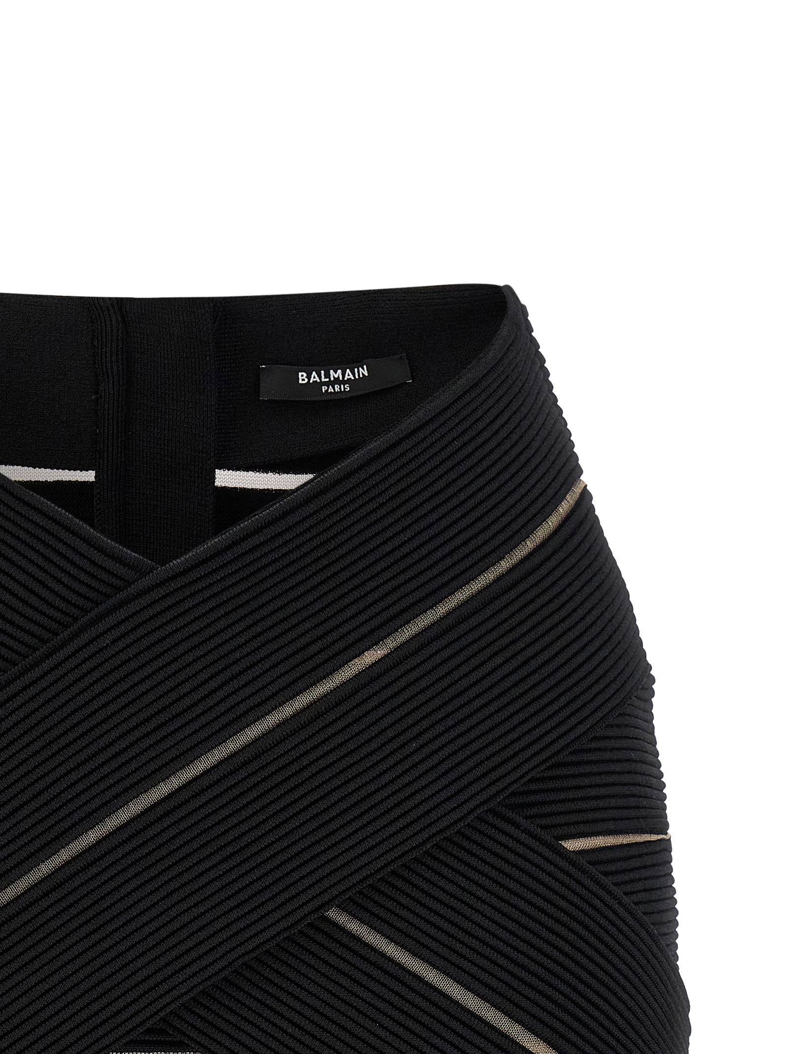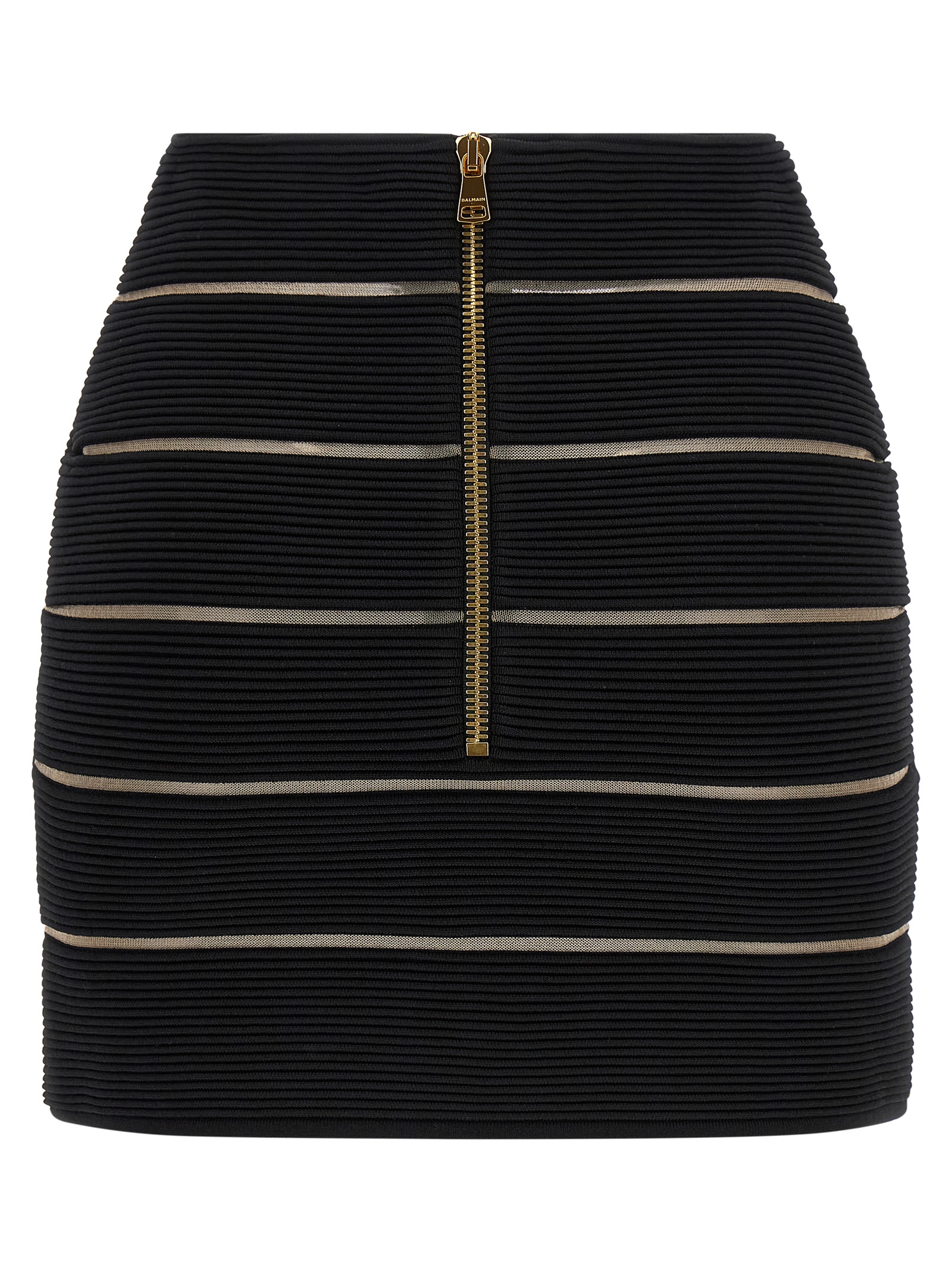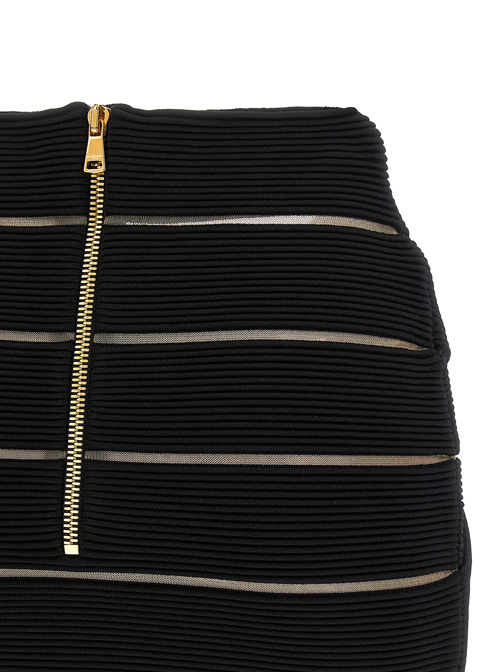Stretch viscose mini skirt with transparent mesh inserts, V-waist with front x-shaped insert, Back zip closure.