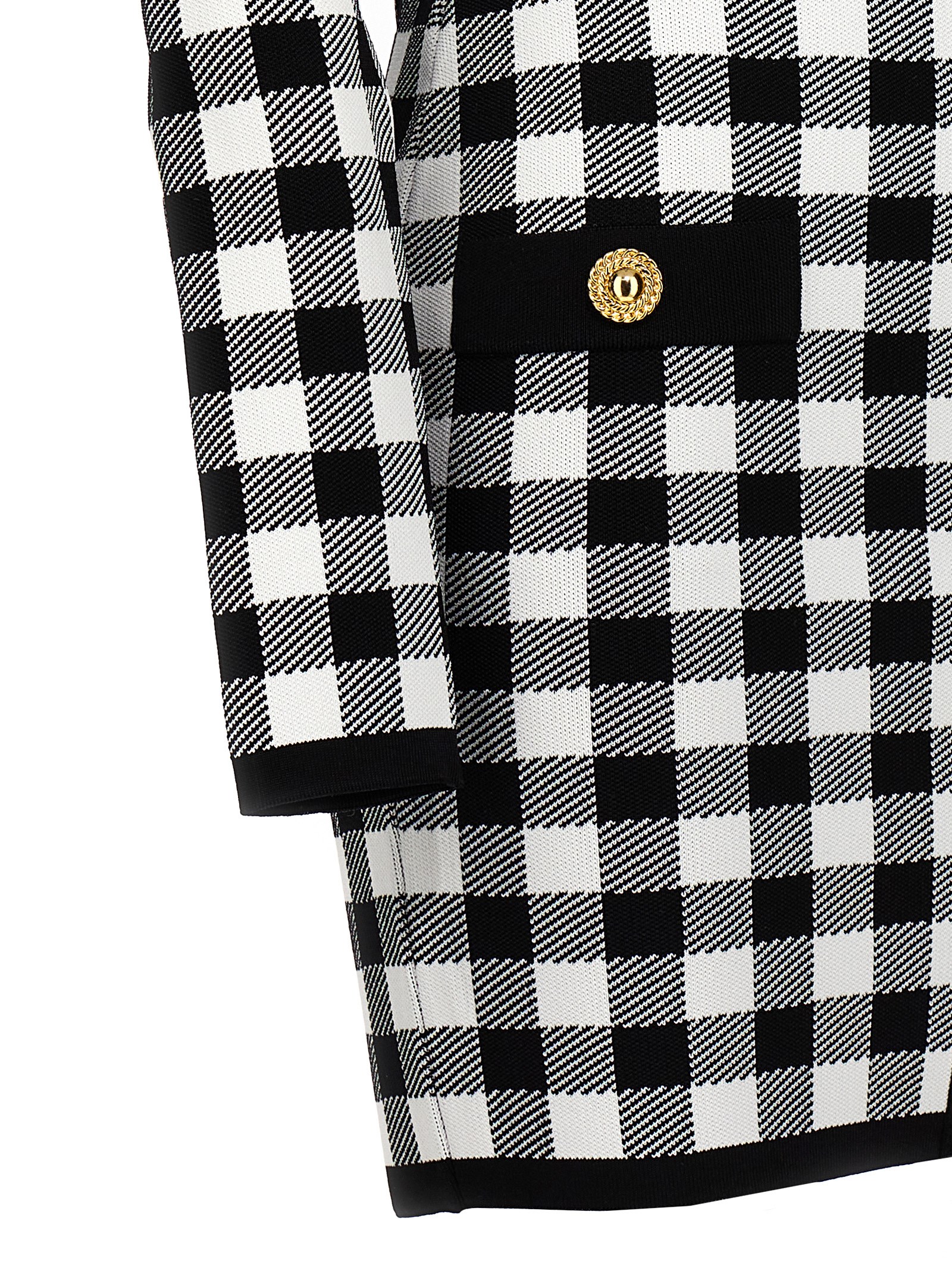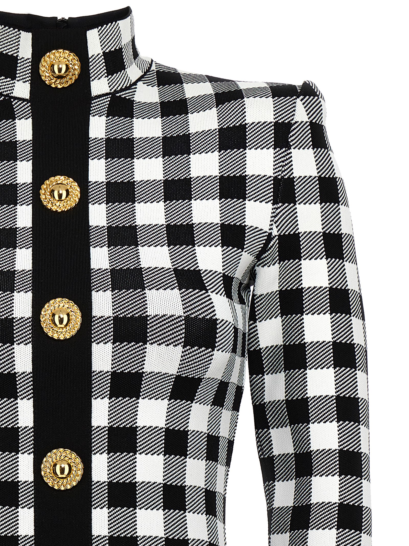 Vichy print viscose blend knit dress, high neck, long sleeves, back zip closure, padded shoulders, front logo buttons.