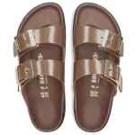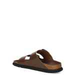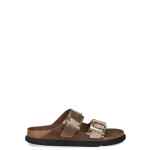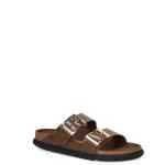 brown slip-on style double buckled strap moulded footbed open toe cork platform flat rubber sole Arizona sandals. Size and Fit – Narrow fit