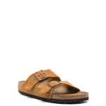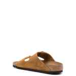 camel brown calf suede debossed logo to the side logo-engraved buckle open toe double buckle fastening moulded footbed branded footbed flat rubber sole slip-on style Arizona sandals. Size and Fit – Narrow fit