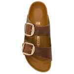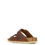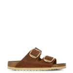cognac brown/gold leather open toe double-strap design buckle fastening branded leather insole flat sole Arizona sandals. Size and Fit – Narrow fit