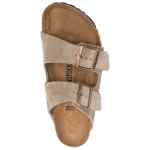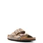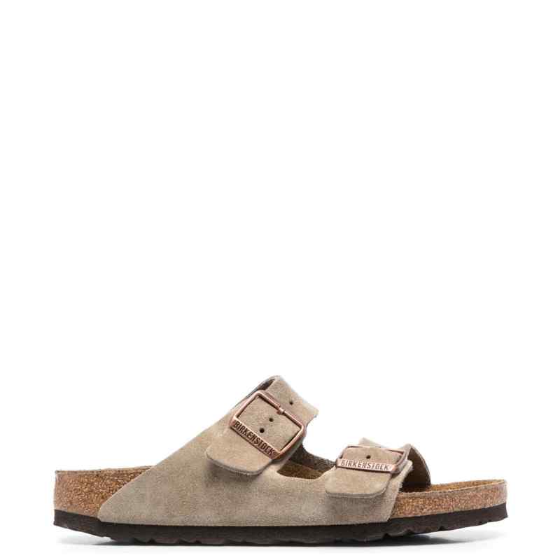 taupe brown calf suede double buckle fastening open toe slip-on style moulded footbed flat rubber sole Arizona sandals. Size and Fit – Narrow fit
