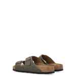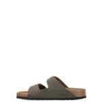 khaki leather slip-on style cork footbed double-strap design buckle fastening open toe EVA midsole flat sole Arizona sandals. Size and Fit – Narrow fit