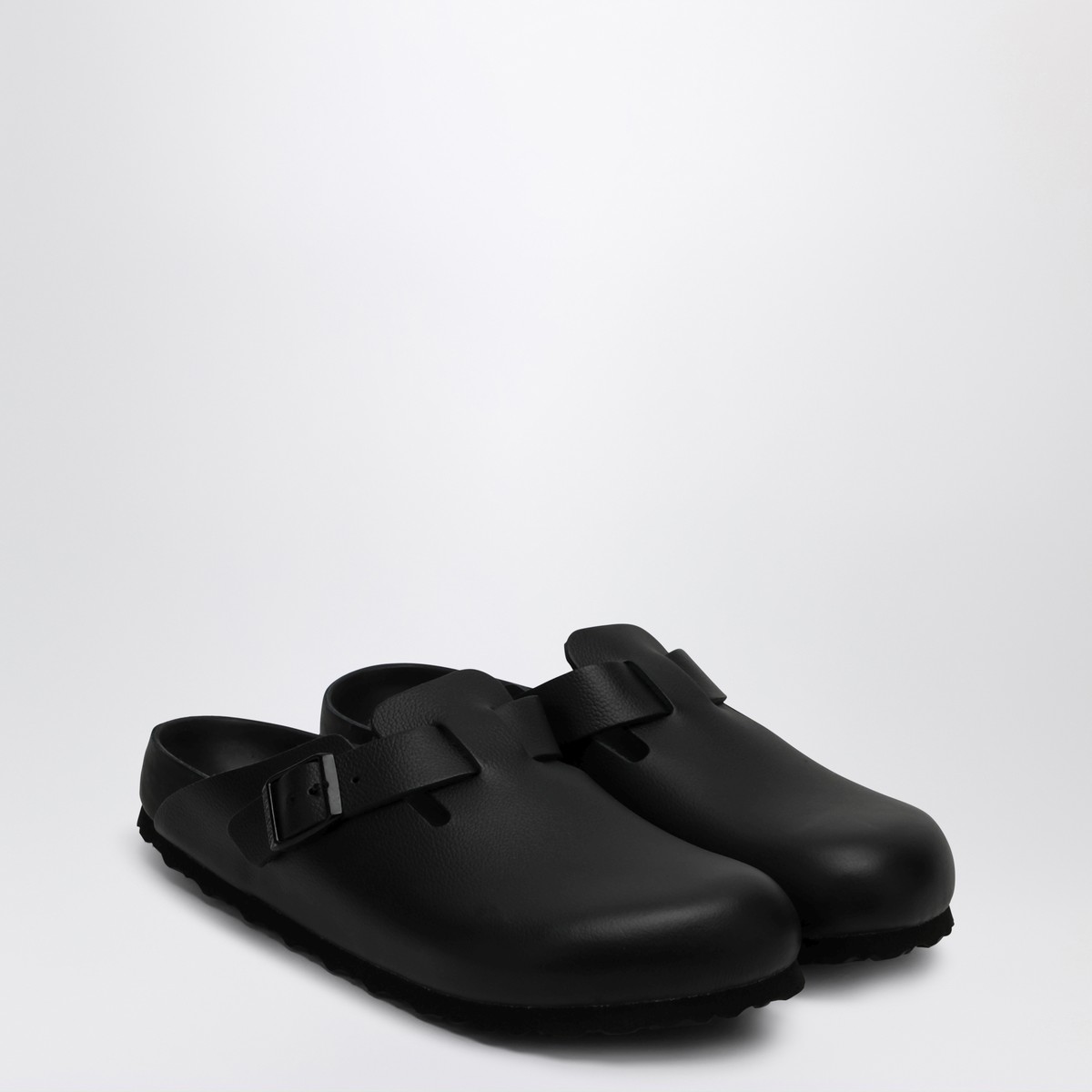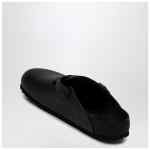 Birkenstock ciabatta in smooth black leather, characterized by a round toe, strap with an adjustable metal buckle, anatomically shaped cork and latex insole, and EVA rubber sole.
